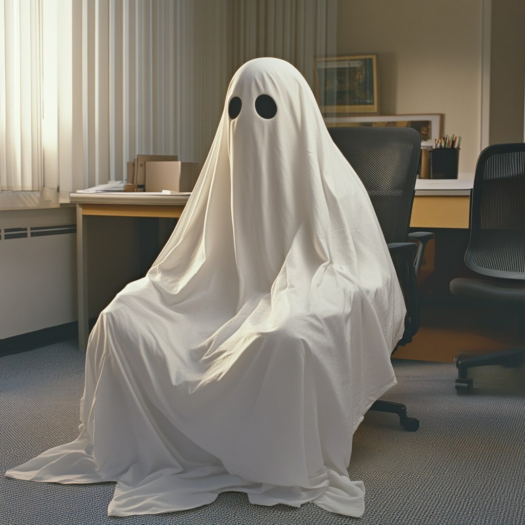 Создано на основе запроса: a ghost in a white blanket. make it hyper realistic and in an office