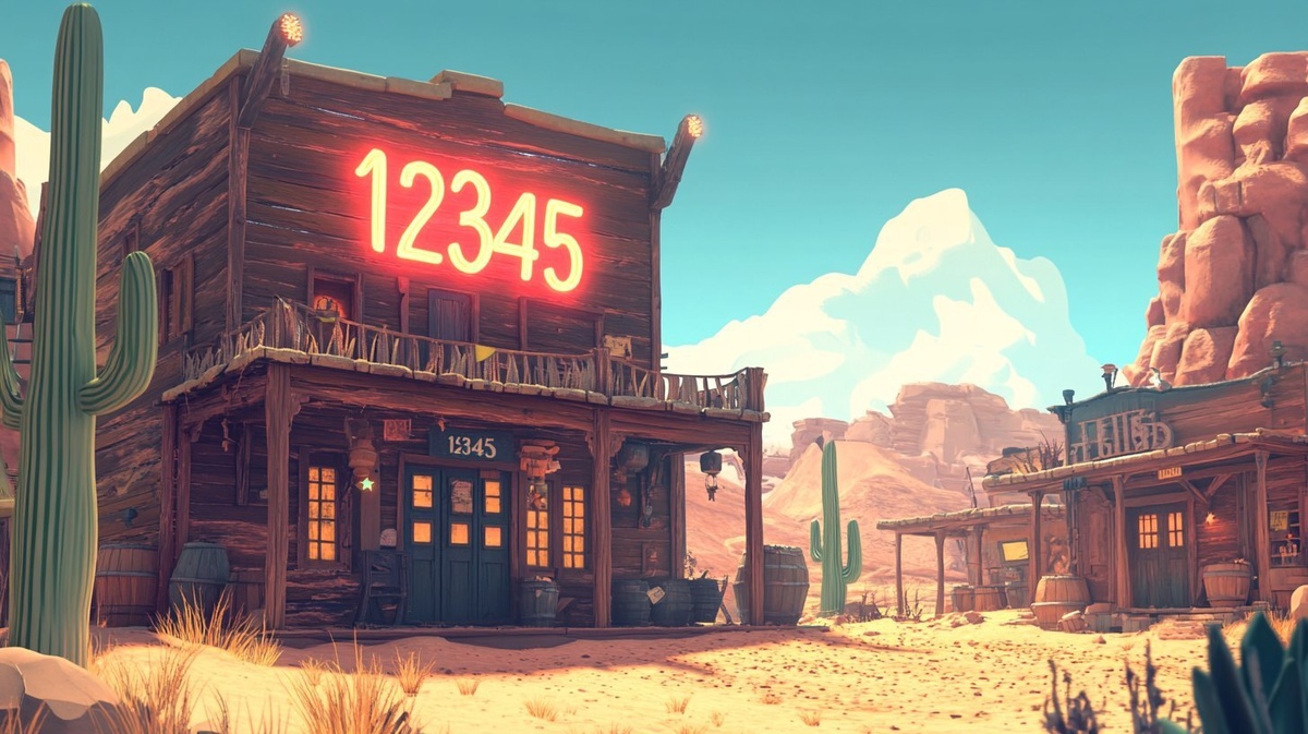 Создано на основе запроса: western dusty mining town at light sky, tumbleweeds, saloon with glowing numbers "12345" on sign above the door