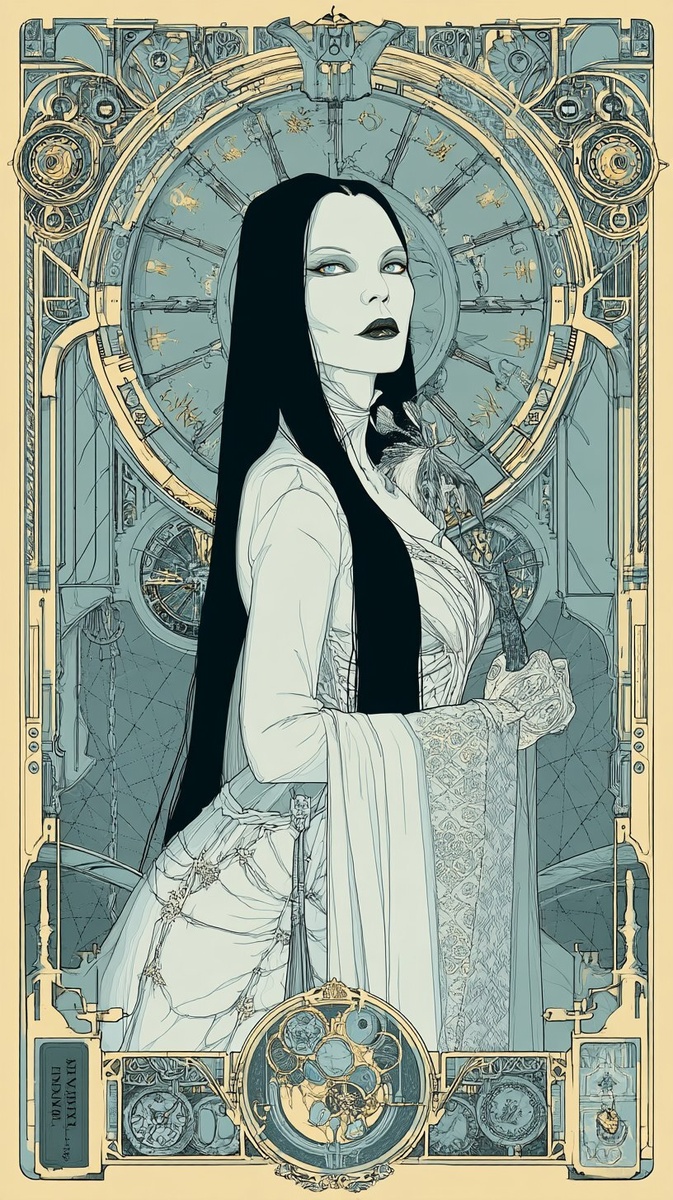 Создано на основе запроса: Bayeux Tapestry of Tarot card "La Llorona" in A framed poster of the Morticia Addams form Addams Family with a