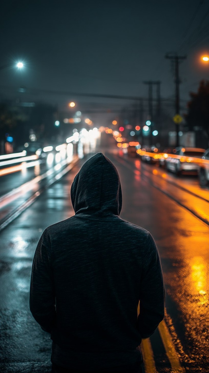 Создано на основе запроса: a cinematic photo of a man in his 30s wearing a hoodie, standing alone in the middle of a street at night, cars