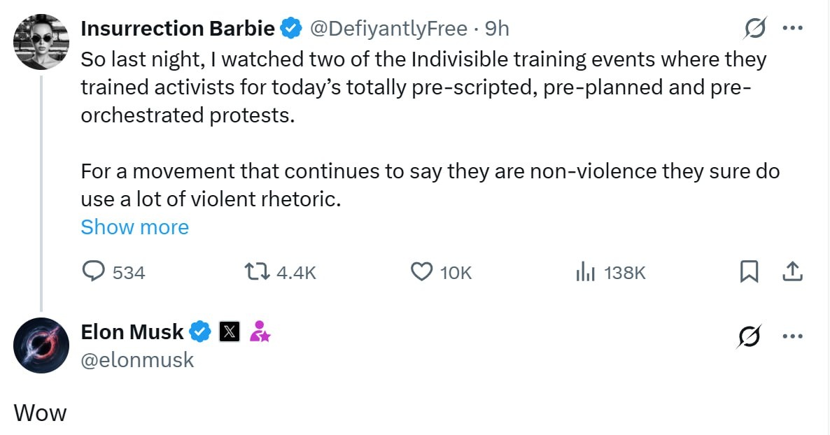Musk shocked by MILITARY-style training of anti-Trump protests