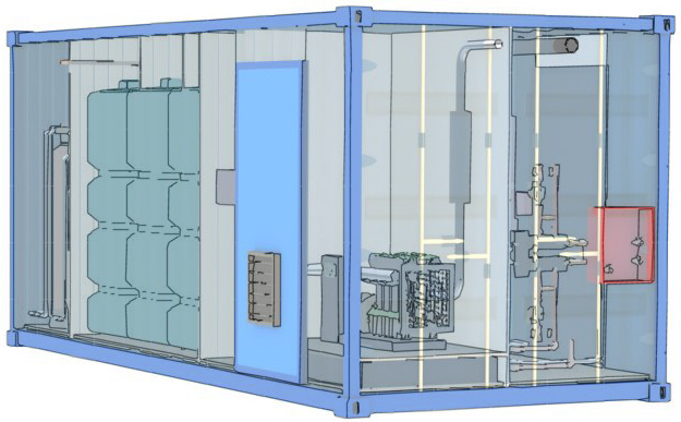 В одном углу ставим, ближе к ёмкости с топливом, дизельный котёл и ДГУ, а в другом размещается и насосная станция и водоподготовка. В средней части, желательно на небольшом демпферном подиуме, ставим баки для воды. И вот, наш автономный инженерный модуль жизнеобеспечения готов – три в одном: Энергия Вода Тепло (ЭВТ).