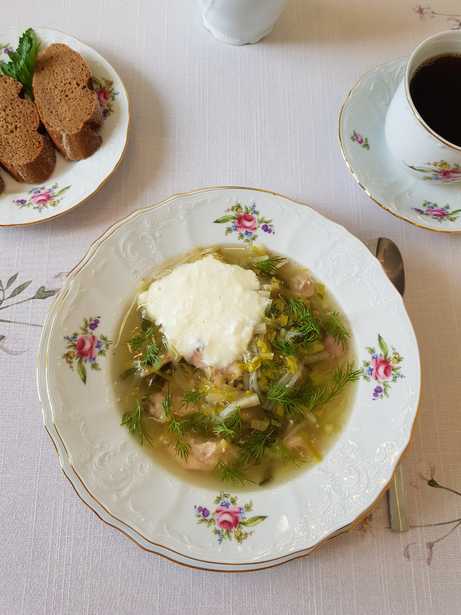 Добрый день, дорогие друзья! Сегодня отмечают свой профессиональный праздник уникальные люди — геологи! Есть хорошо известная фраза: «Что всё начинается с фундамента», но не все задумываются о том, что благодаря таланту, знаниям и работе геологов удается построить надежное здание. Геологи рассказывают нам о тысячелетней истории нашей планеты, и так же важно помнить традиции своей семьи и народа. Поэтому сегодня я представляю вашему вниманию блюдо, которое менялось в течение многих лет под воздействием исторических событий, наличию тех или иных продуктов и выполняло разные задачи. Для приготовления нам понадобятся: 2,5 литра куриного бульона, 900 грамм вареного куриного мяса, 150 грамм репчатого лука, 150 грамм лука-шалота, 250 грамм лука-порея, 250 грамм редьки дайкон, 150 грамм стеблей сельдерея, 350 грамм соленых огурцов, 250 грамм рассола, 50 грамм шпината, 1/2 чайной ложки сахара, 2 лавровых листа, 2 зубчика чеснока, 30 грамм подсолнечного масла, 20 грамм сушеных корня сельдерея, п