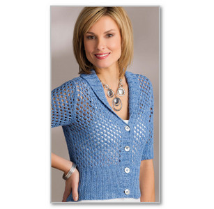 Вам потребуется: пряжа S.Charles Collezione Nina (77% лен, 23% хлопок, 127 м/50 г), 300 (300, 350,400, 400) г голубого цвета (007), 4 пуговицы, спицы № 4.
