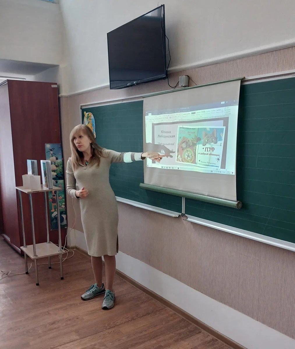 💥 Юлиана Лебединская открывает литературный мир школьникам Макеевки В завершение НДК Юлиана Лебединская встретилась с четвероклассники (было 3 класса) средней школы №8 Макеевки (ДНР). Более того, она стала первым писателем, который к ним приехал с мероприятием! "Для наших детей особенно важно проводить подобные мероприятия, именно потому, что проходят они, в силу обстоятельств, не часто..." Юлиана рассказала им о своих книгах "Пуф круглый год" и "Пуф и добрый обманщик", ответила на многочисленные интересные вопросы, провела мини-викторину с вопросами о животных и подарила детям открытку со своими персонажами (котёнком Пуфом) и автографами. Библиотеке подарила книги. Юлиана Лебединская — участник проекта «Завтрашние классики: воспитание через слово», реализуемого Союзом детских и юношеских писателей при поддержке Президентского фонда культурных инициатив.