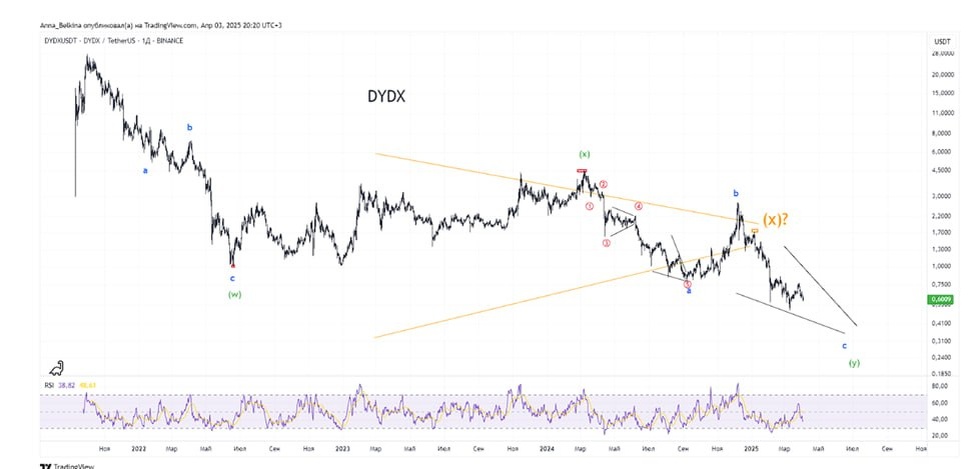 Разметки из видео по крипте по запросам подписчиков: https://dzen.ru/media/id/65b8789ff12bfe0796a26941/video-67eff53af4fc64265df44cac #Dydx Слабая молодая монета. Движение вниз идёт двойным зигзагом. В основе цветной счет предполагает снижение в последней волне (с) of (y) в виде КД. Есть вариант (оранжевый) с более продолжительным (х) в виде бегущего вниз треугольника. Тогда проход вниз будет еще более глубоким. Приоритет движения вниз. Подробнее в видео. Не является ИИР
