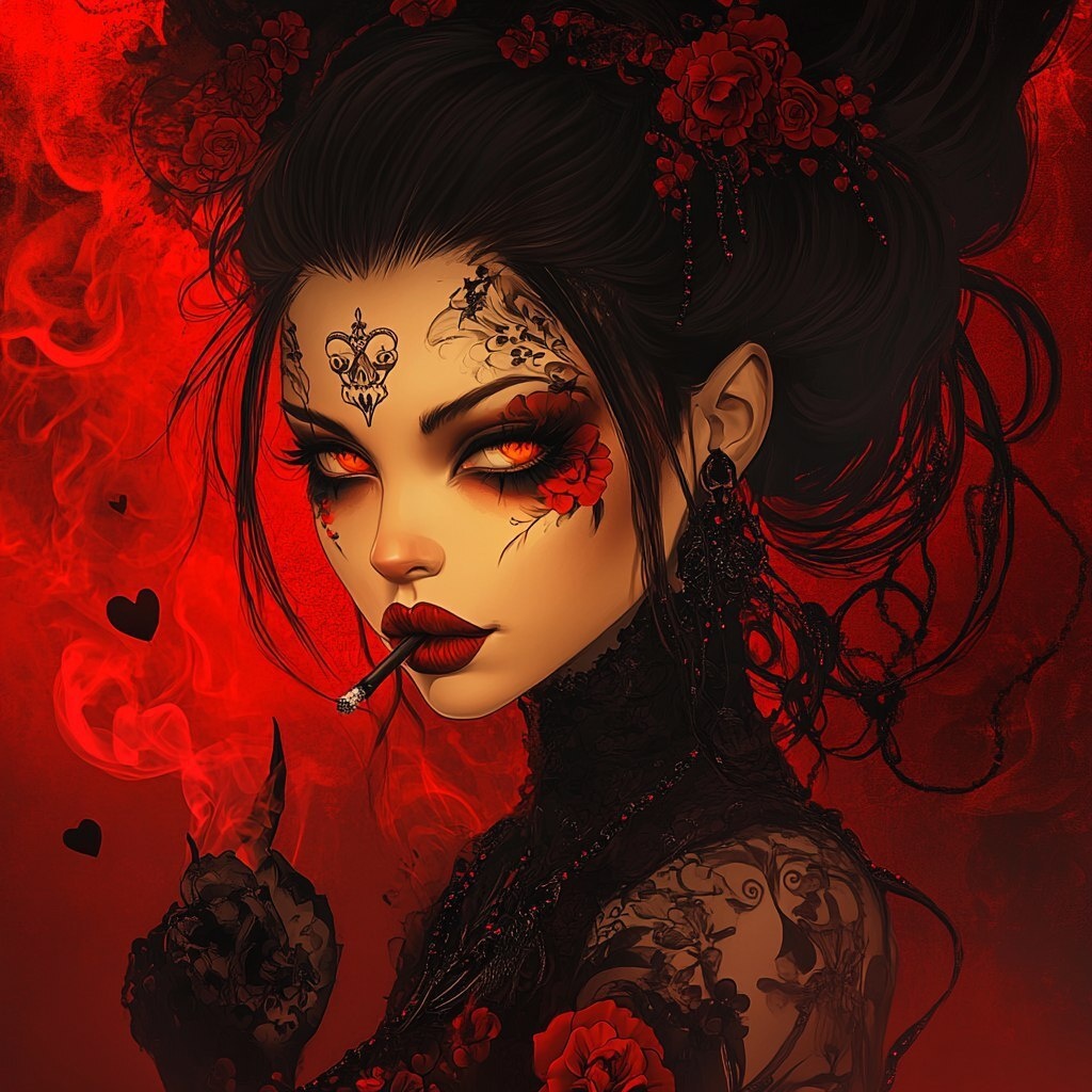Создано на основе запроса: Image is a digital artwork featuring a stylized, fantasy portrait of a woman with striking features. She has long, flowing hair with a gradient of black to vibrant red, and her skin is pale. Her face and neck are adorned with intricate tattoos, including floral and skull designs. Her eyes are accentuated with bold, red eyeshadow, and she wears dark lipstick. The woman is exhaling a cloud of smoke that transforms into red hearts, adding a surreal element to the scene. She holds a cigarette between her fingers, which are also tattooed. Large, ornate earrings dangle from her ears, and she wears multiple necklaces. The background is a blend of red and black hues, with floating skulls and hearts, enhancing the mystical and gothic atmosphere