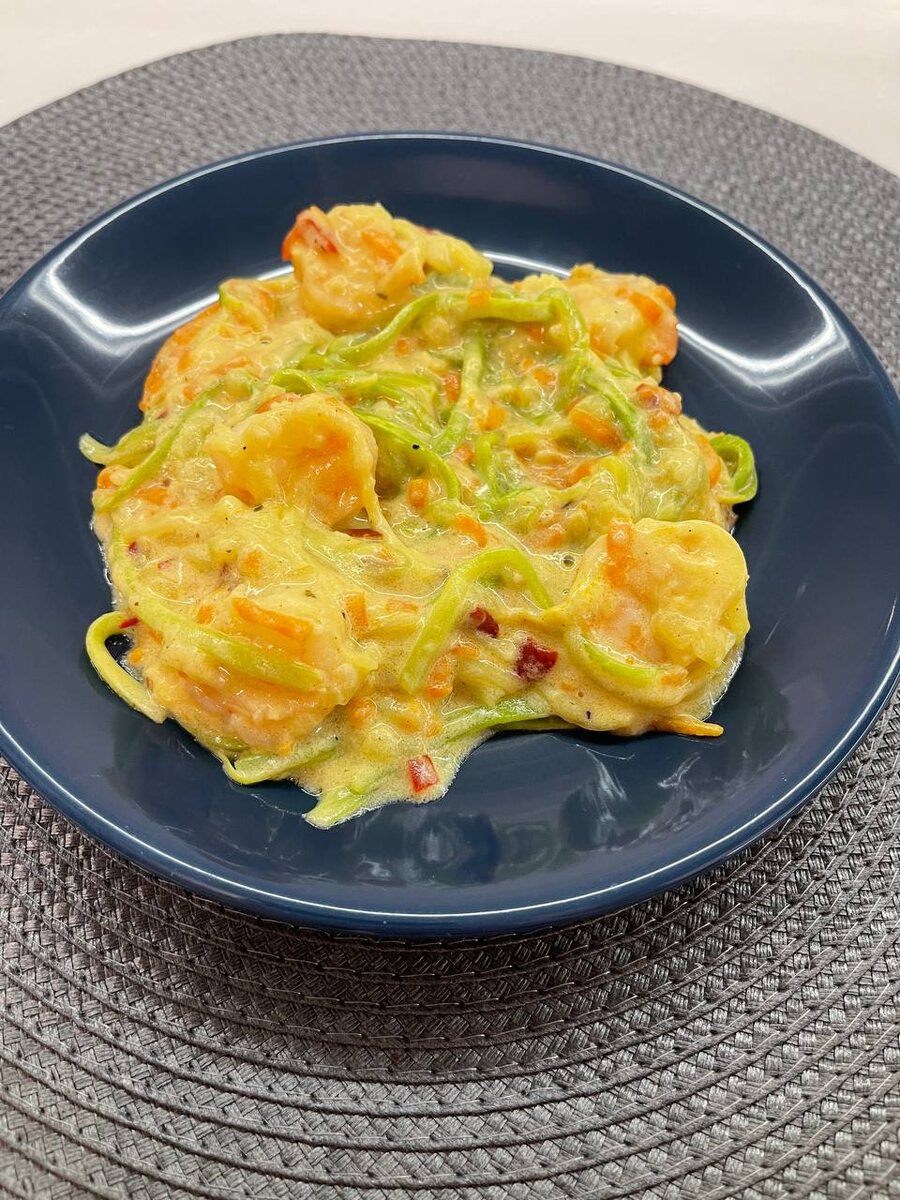 Паста из кабачков с креветками Ингредиенты: Кабачок Морковь Креветки Сливки 20% 200 мл. Мука Вяленый перец Чеснок Соль и специи по вкусу Масло сливочное Приготовление: Креветки очистить, обдать кипятком. Кабачок и морковь нашинковать соломкой. Креветки, чеснок и морковь обжарить на сливочном масле. Добавить кабачки, присыпать мукой (1 ст.л.) и хорошо размешать. Добавить перец (можно использовать свежий). Ввести сливки, добавить соль и специи. Оставить тушить, прикрыв крышкой до загустения. Приятного аппетита🌺 #ПП #креветки #кабачок