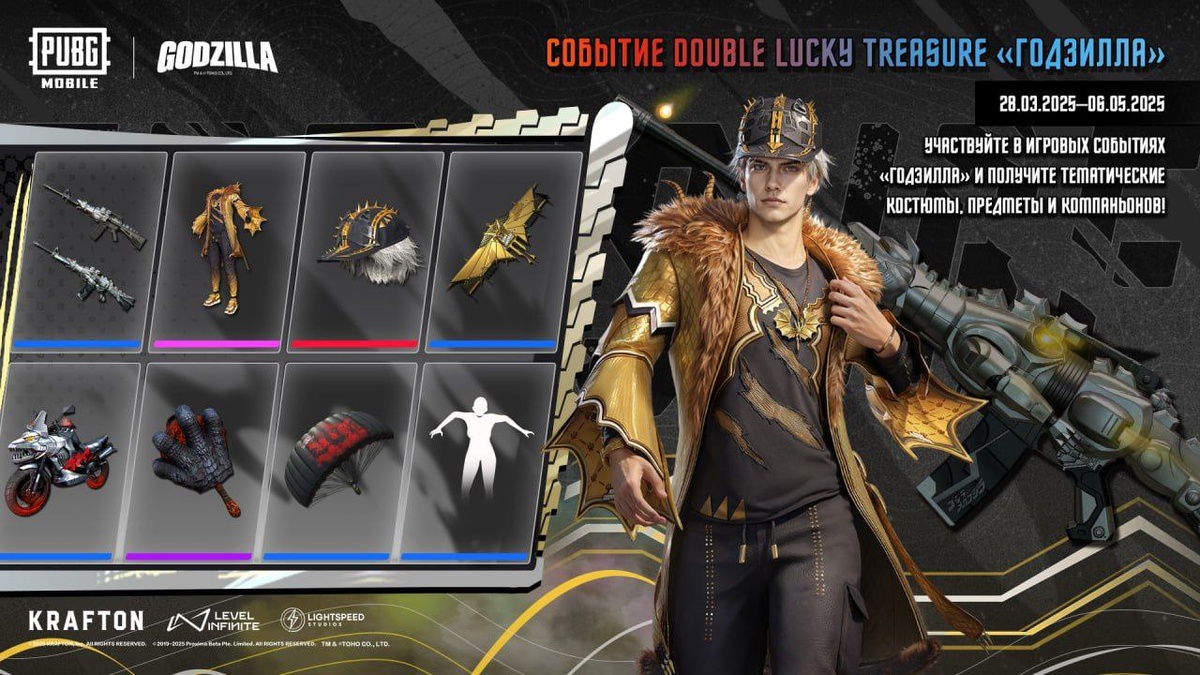 🎉 Событие Double Lucky Treasure дарит много наград! 🎁 Теперь у вас есть шанс получить эксклюзивные наборы, предметы и эмоции! Не ждите — присоединяйтесь к событию и заберите свои награды прямо сейчас! 🔥 📲 Скачайте сейчас: https://pubgmobile.live/Godzilla2025 #PUBGMOBILE #PUBGMxGodzilla #Godzilla #BurningGodzilla #KingGhidorah #Mechagodzilla #kingofthemonsters