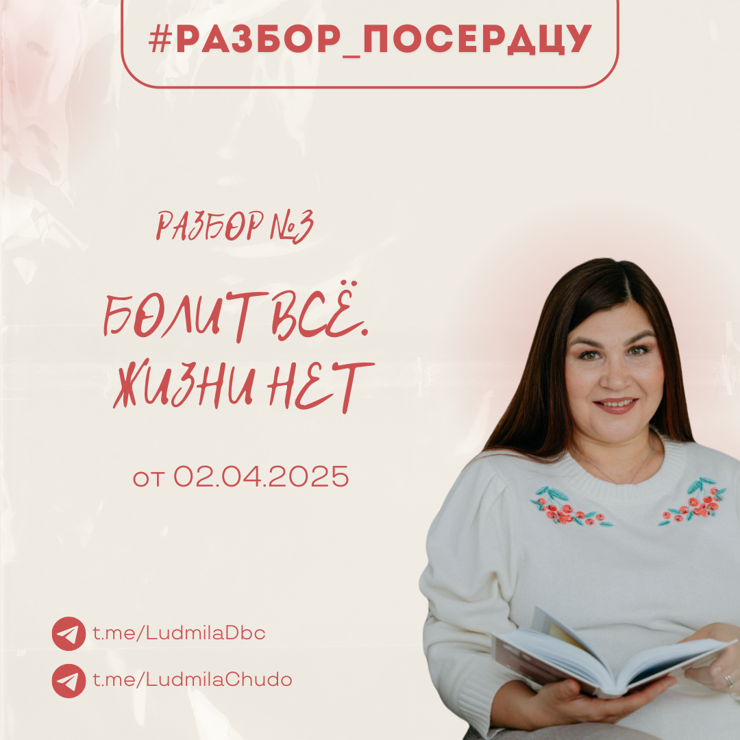 ВК https://vk.com/video-183780789_456239537 Смотрите запись третьего #разбора_поСердцу текущей недели... Это завершение начатого в #давайте_поговорим https://dzen.ru/media/ludmilachudo/smotret-v-vk-67efd2c4b7016862a199932e Рутуб Дзен Ютуб БЛАГОДАРНОСТЬ Людмила Михайловна Д. Сбербанк: 2202203654993528 Т - банк: 2200701785794964