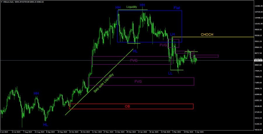 Биткоин забрался во флэт. Новые тарифы Дональда Трампа, которые включают в себя ставки на абсолютно все импортные товары, конечно, спровоцировали падение биткоина, но при этом «в рамках разумного». Биткоин не возобновил нисходящий тренд, не обновил предыдущий минимум(в отличие от того же индекса S&P500). И этот момент нас очень сильно удивляет и напрягает. Текущая техническая картина продолжает указывать на сохранение нисходящего тренда. Однако полное отсутствие желания у рынка продавать «цифровое золото», когда для этого есть все необходимые причины, и когда самый коррелирующий индекс падает в пропасть, заставляет задуматься.