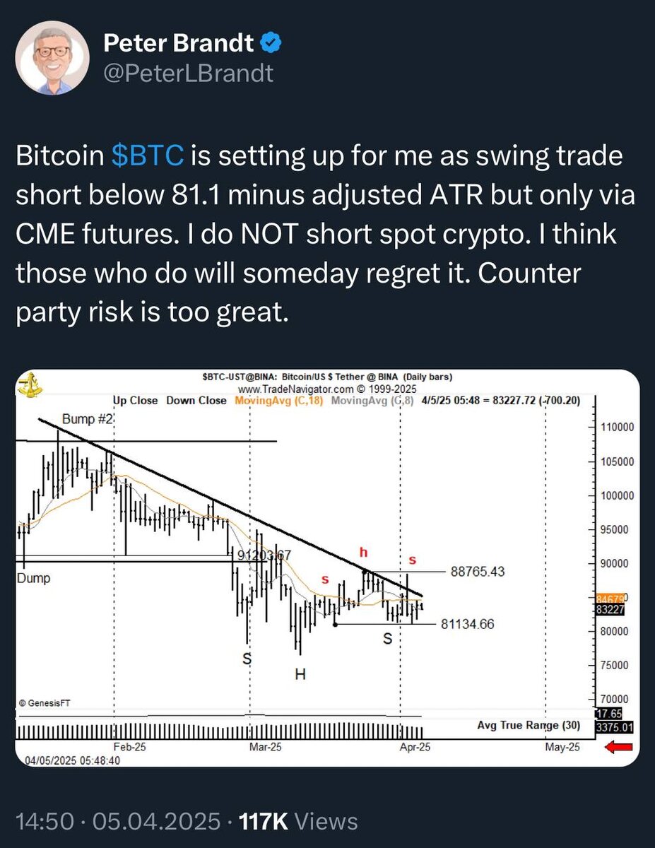 Даже Питер Брандт может ошибаться. Или просто играет по-другим правилам. На днях известный трейдер с 60-летним (!) опытом Брандт опубликовал твит: «Биткоин настраивается на шорт ниже 81.1 (минус ATR) по CME-фьючерсам. Я не шорчу спот — слишком большой риск контрагента». Что он имеет в виду: – если BTC пробивает $81,100 минус волатильность (~$77,700) — он откроет короткую позицию – но только на CME, не на споте – и не потому что он “медведь по биткоину”, а потому что система ему говорит так делать На графике у него — “голова и плечи” Типичная разворотная фигура, но есть нюанс. Фигура появляется не после роста, а после падения — и это меняет смысл. В таких случаях это не “сигнал на слив”, а часто — инверсная фигура разворота вверх. То есть, по классике, это как раз бычий паттерн, а не медвежий. Что видим мы: – Цена несколько раз билась в наклонное сопротивление – Поддержка на $81,134 устояла – Объёмы не умирают — идёт накопление – Медведям не удаётся продавить рынок, хотя страха