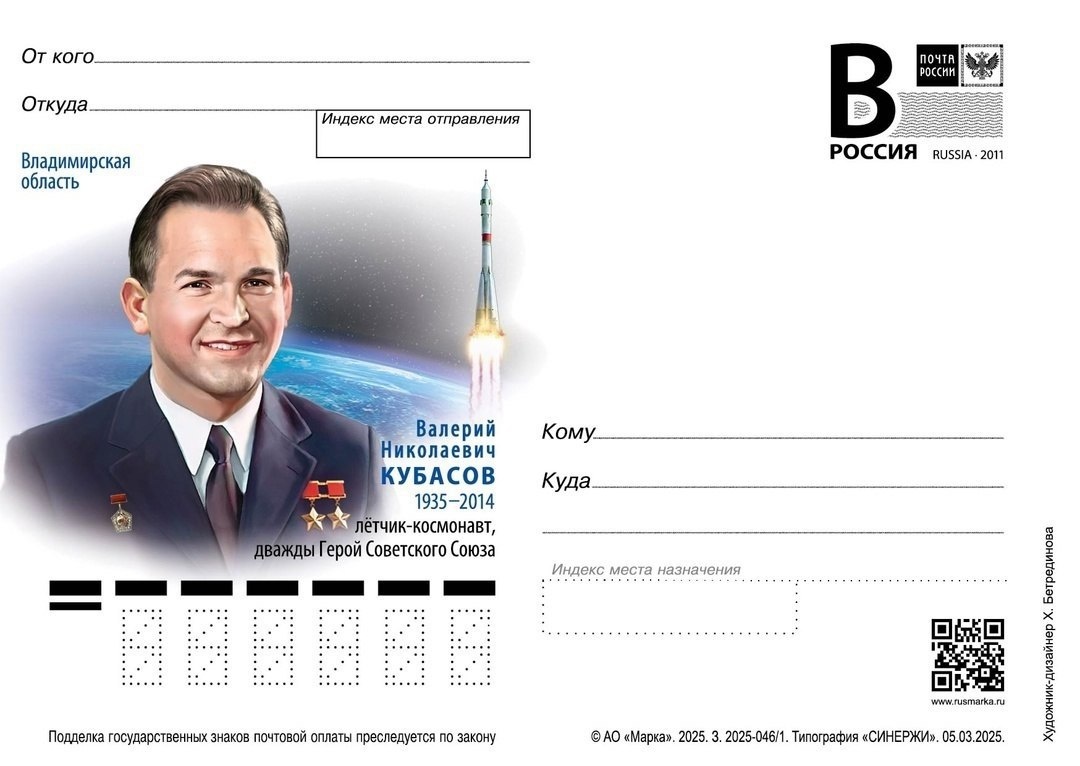 К 90-летию Валерия Кубасова — специальные почтовые конверты Прославленный уроженец Вязниковского района, лётчик-космонавт, дважды Герой Советского Союза, Валерий Кубасов — гордость не только малой родины, но и всей России. Официальная церемония гашения карточки намечена на вторую половину апреля. Общая продолжительность космических полётов вязниковца - 18 суток 17 часов 59 минут. А их в его жизни было три. Первый полет состоялся в октябре 1969 год, второй — в июле 1975 года и третий — в 1980-м году. Валерий Николаевич никогда не прерывал связи с владимирской землей. А о Вязниках так и говорил: «этот город –всегда в моём сердце».