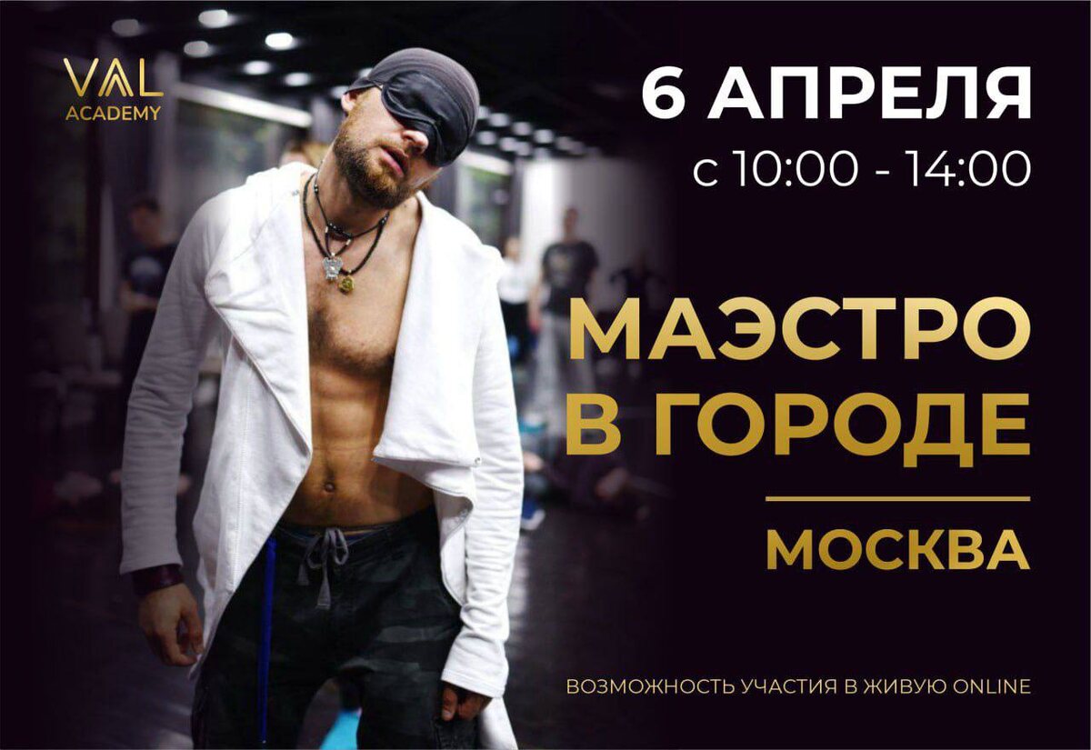 МАЭСТРО В ГОРОДЕ | МОСКВА VAAL DYNAMIC ENERGY | Завтра 📌Когда: 5 апреля 10:00-14:00 📌Где: Москва 🔥Самая масштабная телесно-эмоциональная практика от Александра Вааль 🔥Большой экран с видеорядом для практики 🔥Объемный звук 🔥Мощнейший Networking Практика направлена на: ✔️Очищение тела, эмоций, ума; ✔️Включение ресурсного состояния; Вступайте сразу в чат https://t.me/+5hPdX4l8MrwzYmQy Либо регистрируйтесь по ссылке https://iavaal.com/maestro_city С кем увидимся?💜