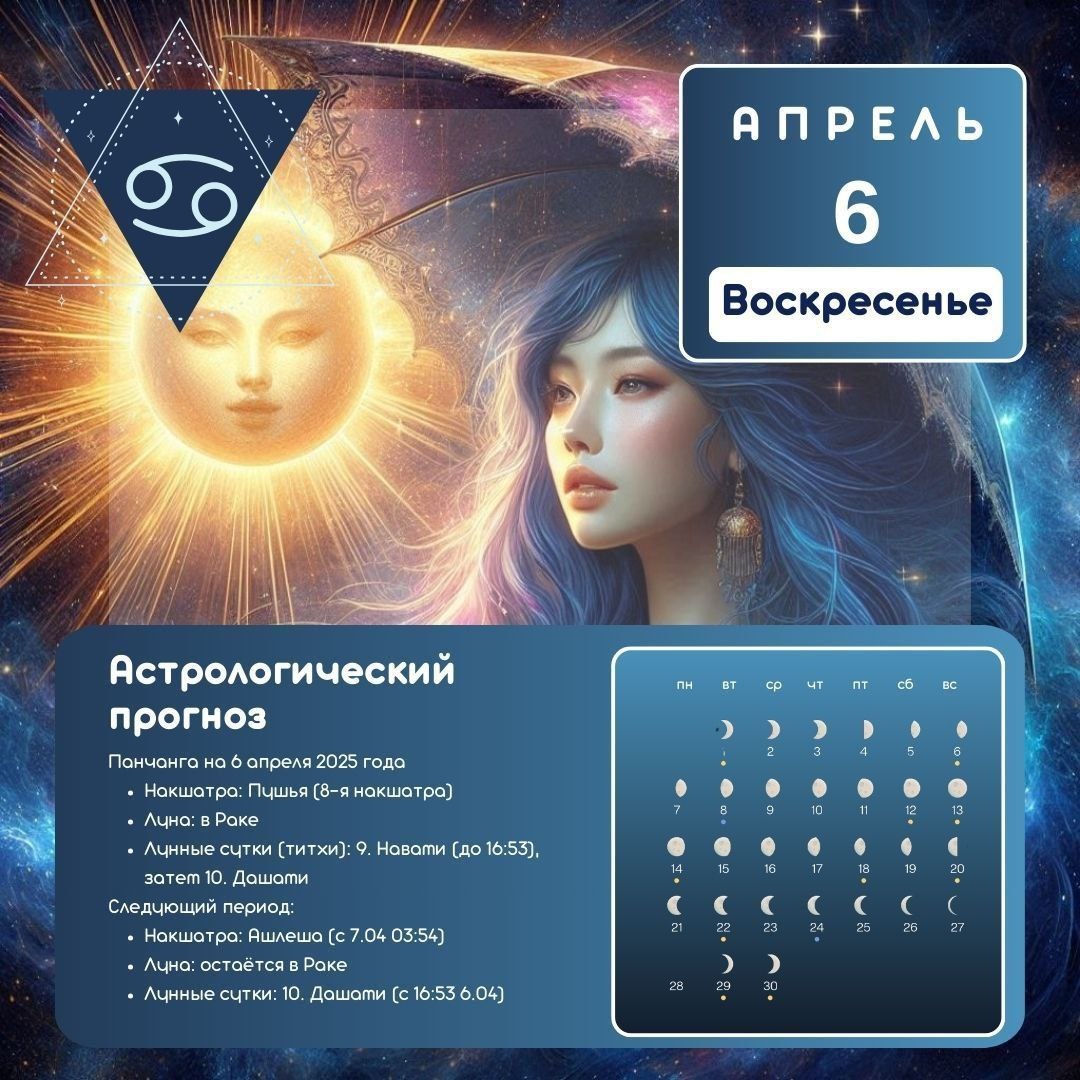 Астрологический прогноз в системе Джйотиш на 6 апреля 2025 года (воскресенье, Рама Навами) ✨ День победы света над тьмой, торжества дхармы и божественной гармонии ✨ Общая энергетика дня Сегодняшний день — особенно благоприятный, так как совпадает с Рама Навами — днём явления Господа Рамачандры, седьмого воплощения Вишну. Это время восстановления божественного порядка, торжества праведности (дхармы) и внутреннего очищения. 🔹 Планетарные аспекты: - Солнце (Рави) — управитель воскресенья, усиливает волю, решимость и духовную силу. - Луна (Чандра) — в растущей фазе (Шукла Пакша), что способствует росту благих начинаний. - Накшатра Пушья (8-я звезда, управляемая Сатурном (Шани) — одна из самых благоприятных накшатр, дарующая успех, защиту и поддержку высших сил. - Сарвартха Сиддха Йога (формируется в воскресенье под Пушьей) — идеальное время для любых благих дел, особенно духовных практик, молитв и благотворительности. 🔹 Благоприятные периоды: - Мадхьяхна Каала (11: