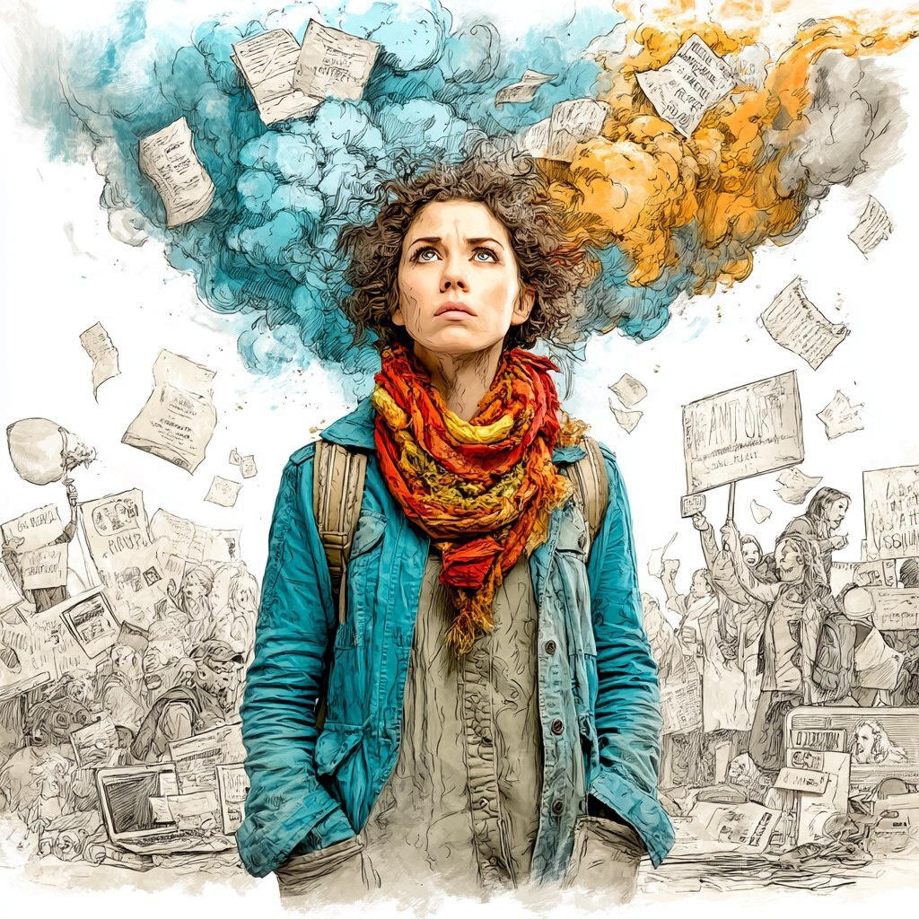 Создано на основе запроса: Surreal poster-style artwork of a woman standing still as chaos swirls around her burning papers, screaming screens, protest signs, and storm clouds but she holds a torch lit with soft white light, hyper-detailed, symbolic, oil-painting texture meets documentary realism --- Автоперевод: Сюрреалистические художественные работы в стиле плаката о женщине, стоящей на месте, когда хаос кружится вокруг ее горящих бумаг, кричащих экранов, протестных знаков и штормовых облаков, но она держит факел, освещенную мягким белым светом, гипер-хитрости, символическим, нефтяным текстурой. Отлично вышло? 🤔 https://dzen.ru/id/65c0c65c86e4f837c27b24d7 #ИИ #AI #нейросеть #midjourney #art