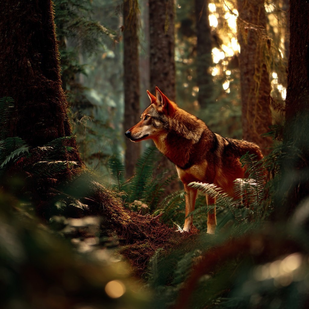 Создано на основе запроса: A red wolf in a mythical forest