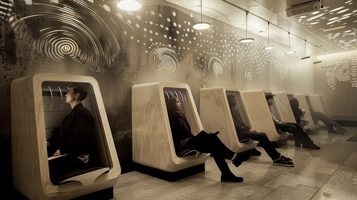 Создано на основе запроса: sound experience room, a photograph of people sitting in the individual sound pods built-in the wall, a modern