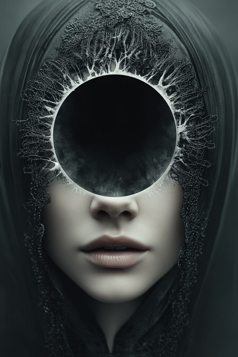 Создано на основе запроса: goddess stares into the abyss, the void in her eyes grows larger, single blacked out wide pupil, no iris visible