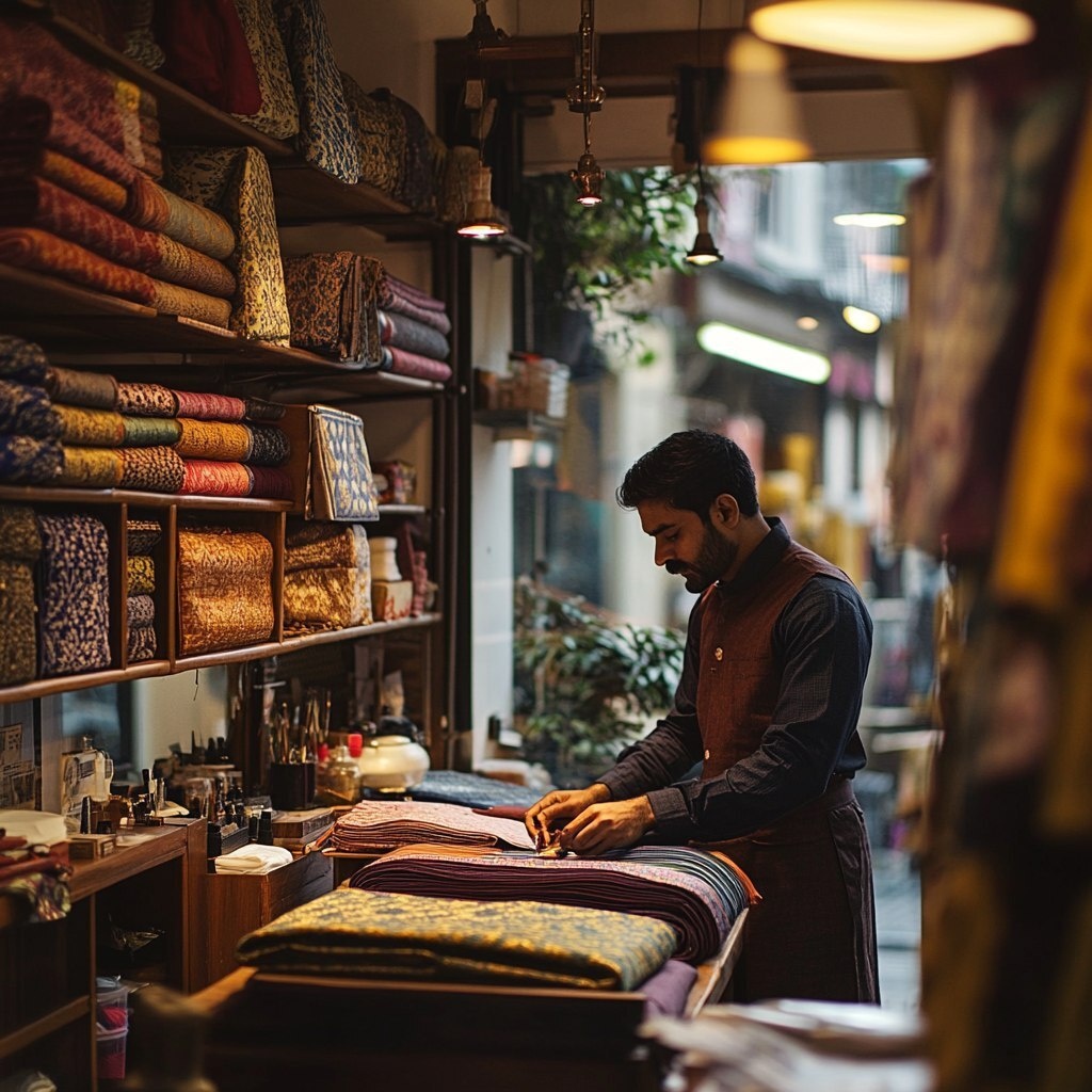 Создано на основе запроса: Interior of a cozy tailor shop in London, blending Indian and British aesthetics, wooden shelves with colorful