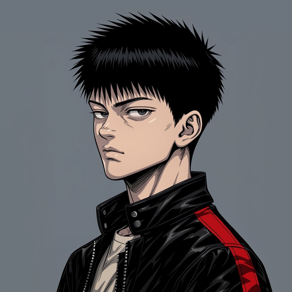 Создано на основе запроса: male side profile photo Katsuhiro Otomo - Akira style midshot anime-style man with short spiked black hair and a