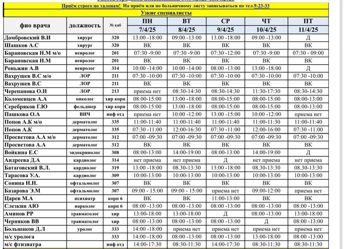Актуальный график работы врачей с 7 апреля • Городской поликлиники; • Детской поликлиники; • Стоматологической поликлиники; • Женской консультации. Возможны изменения. Уточняйте расписание на официальных ресурсах или по телефону кол-центра: 9-23-33. 👉 Подписаться