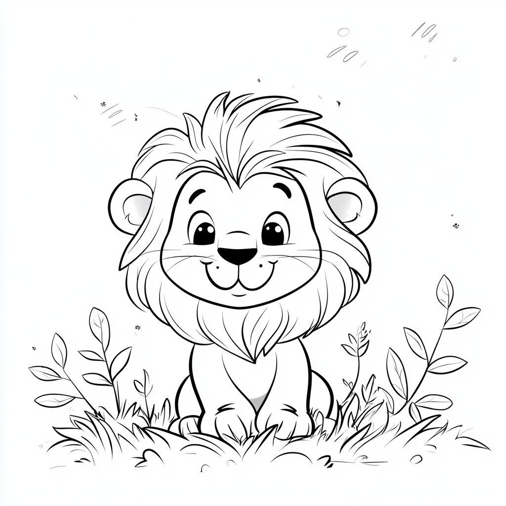 Создано на основе запроса: A small cartoon lion with a fluffy mane sitting on the grass with a gentle smile, surrounded by a few simple
