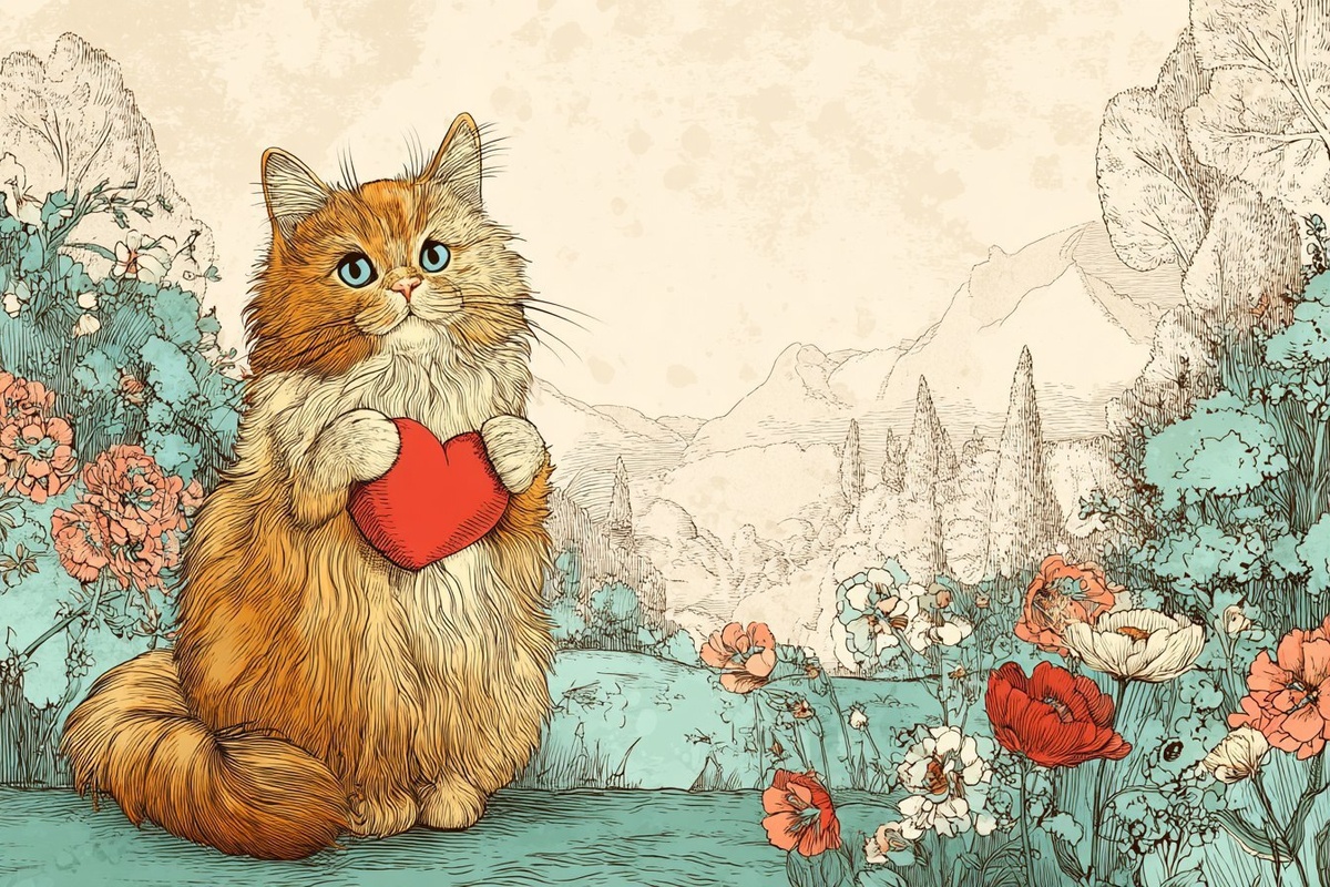 Создано на основе запроса: vintage clipart in style of high detailed 2d illustration for a lovely, and romantic greeting-card featuring a cute ginger cat, with fluffy fur, holding a red heart in paws; background with beautiful flowery landscape; make the picture in retro pastel color, full body, --- Автоперевод: Винтажный клипарт в стиле высокой детальной 2D иллюстрации для прекрасной и романтической карты приветствия с милой имбирной кошкой, с пушистым мехом, держащим красное сердце в лапах; Какое твое впечатление? 🤔 https://dzen.ru/id/65c0c65c86e4f837c27b24d7 #ИИ #AI #нейросеть #midjourney #art