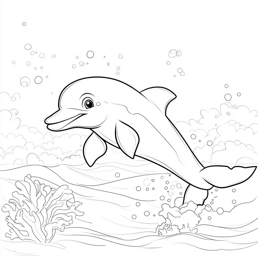 Создано на основе запроса: a carton of a cute dolphin in the sea, children coloring book lineart