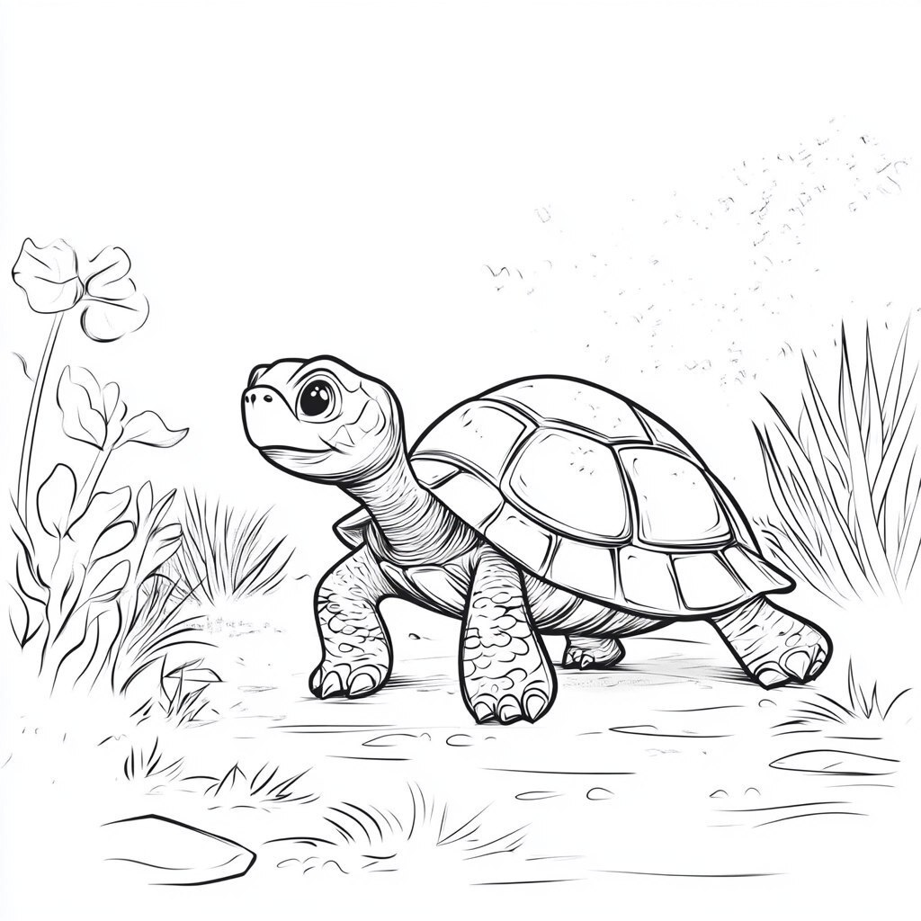 Создано на основе запроса: A cartoon turtle slowly walking across a dirt path, simple plants around, black and white line art for children