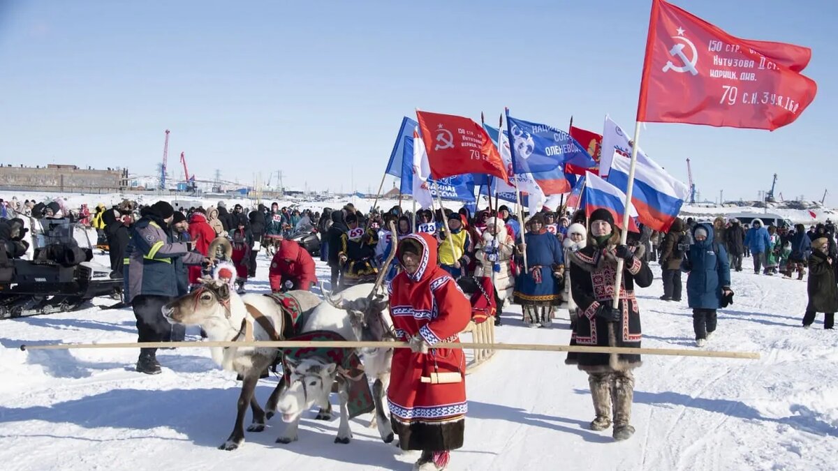 Копию Знамени Победы торжественно вручили президенту Национального союза оленеводов России Михаилу Яру в Дудинке Красноярского края. Об этом сообщила пресс-служба правительства ЯНАО. «Арктическая эстафета Победы» стартовала 17 марта на Чукотке и завершится 16 апреля в Салехарде. Она охватывает 5,5 тысячи километров и четыре арктических региона: Чукотский автономный округ, Республику Саха (Якутия), Красноярский край и Ямал. Патриотическая акция объединяет людей и напоминает о героизме, проявленном во время войны. Участники проекта преодолеют более двух тысяч километров по Ямалу. В селах Антипаюта, Новый Порт, Яр-Сале и Аксарка состоятся парады оленьих упряжек», — сказал Яр. Копию Знамени Победы из Красноярского края на Ямал доставит оленья упряжка. Первым пунктом эстафеты станет Тазовский район — стойбище оленеводов семьи Алексея Яптика. Далее символ Победы доставят в Пуровский, Надымский, Ямальский и Приуральский районы. Важной частью акции станет работа с молодежью: в школах населенны