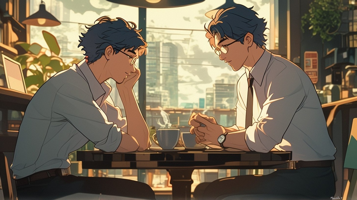Создано на основе запроса: A wide shot of a cozy daytime café with warm natural light streaming in through a large window. A middle-aged Japanese man sits across from his colleague at a wooden table and engages in conversation. He is dressed in relaxed business casual attire, a white shirt with rolled-up sleeves and navy slacks, holding a cup of coffee and leaning slightly forward with a curious and slightly hopeful expression. Anime Style,