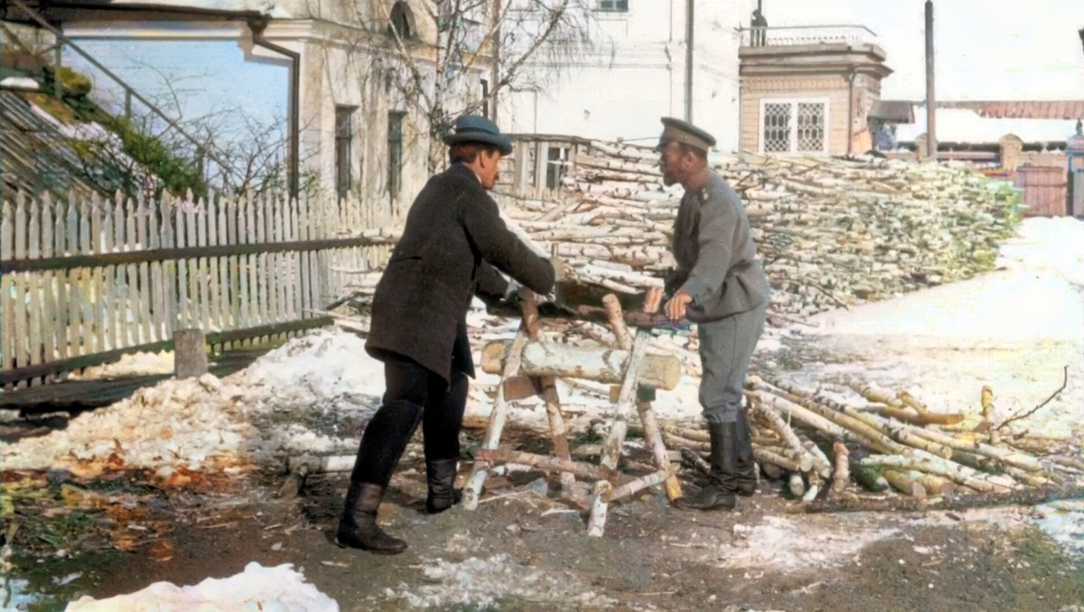 На этой фотографии Николай Александрович Романов. Последний Император. 1917-1918 год. Тобольск. Сам пилит дрова. Живёт скромно.
