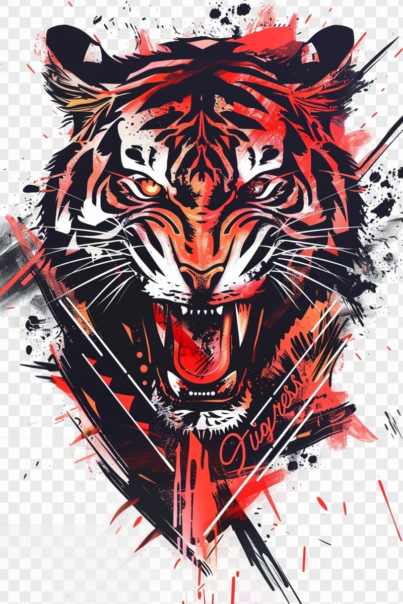 Автоперевод: [Текст: «tigress.shop»] интегрирован с жесткой тигровой головой в стиле уличного искусства граффити, неоново -красный (#ff0000) и черными цветами, динамические удары, симметричный дизайн, изолированный на прозрачном фоне,
