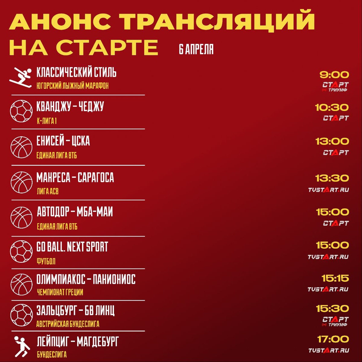 🍿📺 Обилие трансляций в воскресенье на «Старте» Начинаем последний день недели в Ханты-Мансийске на лыжном марафоне. Далее нас ждёт множество баскетбола. Выделим выездной матч ЦСКА, домашний «Зенита», первые игры «Олимпиакоса» и «Панатинаикоса» в плей-офф, а также эль-класико вечером на десерт. Посмотрим новый футбольный формат под названием «Go Ball. Next Sport», «Зальцбург» продолжит погоню встречей с «БВ Линц», «Аякс» примет «Бреду», ну и завершим день противостоянием «Порту» – «Бенфика». Оставайтесь с нами на TVSTART.RU 🖥 🛒 Наше приложение в Google Play (вне РФ) 💙 Наше приложение в RuStore (для РФ) 🛒 Наше приложение в App Store