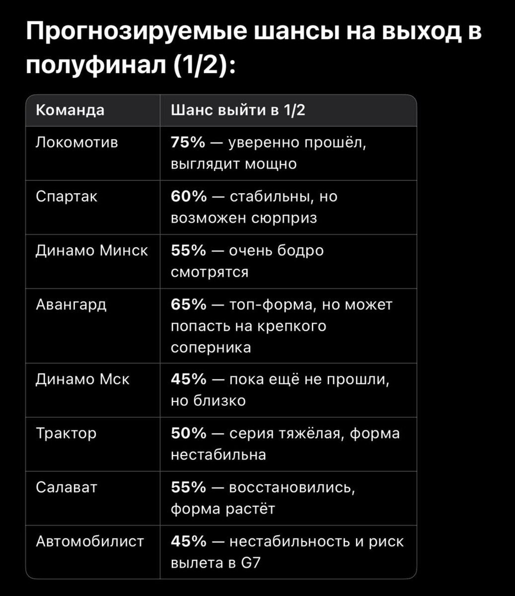 🏒 Продолжаем следить за играми плей-офф Кубка Гагарина вместе с нашим прогнозистом, в роли которого выступает ChatGPT. Итоги 1/8 финала (по сериям до 4 побед): Запад: • «Локомотив» — «Торпедо»: 4–0. • «Спартак» — «Северсталь»: 4–1. • «Динамо Минск» — ЦСКА: 4–2. • «Динамо Москва» — СКА: 3–2 (серия ещё продолжается). Восток: • «Авангард» — «Металлург»: 4–2 • «Автомобилист» — «Ак Барс»: 3–3 (будет седьмой матч). • «Салават Юлаев» — «Сибирь»: 3–2 (серия ещё продолжается). • «Трактор» — «Адмирал»: 3–2 (серия ещё продолжается). Прогноз на оставшиеся матчи 1/8. Сегодня, 6 апреля, пройдут три игры: ⭐️х🔵 СКА — «Динамо Москва»: 60/40 в пользу «Динамо», но СКА на подъёме. Возможен G7. ⚓️х🚜 «Адмирал» — «Трактор»: 55/45 за «Трактор», но «Адмирал» уже показывал зубы — серия на тоненького. ❄️х💚 «Сибирь» — «Салават»: 60/40 за «Салават», особенно после победы 5:2. Но матч в Новосибирске, могут быть качели. В понедельник за выход в 1/4 сойдутся: 🚗х🐆 «Автомобилист» — «Ак Барс»: решающий матч