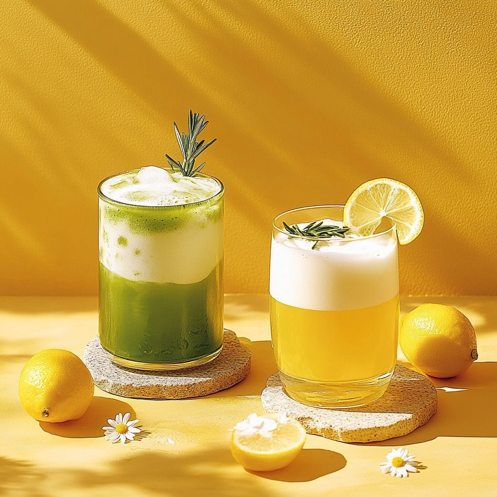Создано на основе запроса: A bright, minimalistic scene with a clean yellow background and surface. Two stylish glass cups with refreshing drinks sit under warm sunlight. One cup contains a green iced matcha drink topped with a thick layer of foam and a rosemary garnish. The other is a clear cup of lemon herbal tea, placed on a textured stone coaster, with lemon slices and a sprig of rosemary inside. Small white chamomile flowers and a fresh lemon rest nearby. The composition is balanced and airy, with soft shadows and a cozy, summery mood.