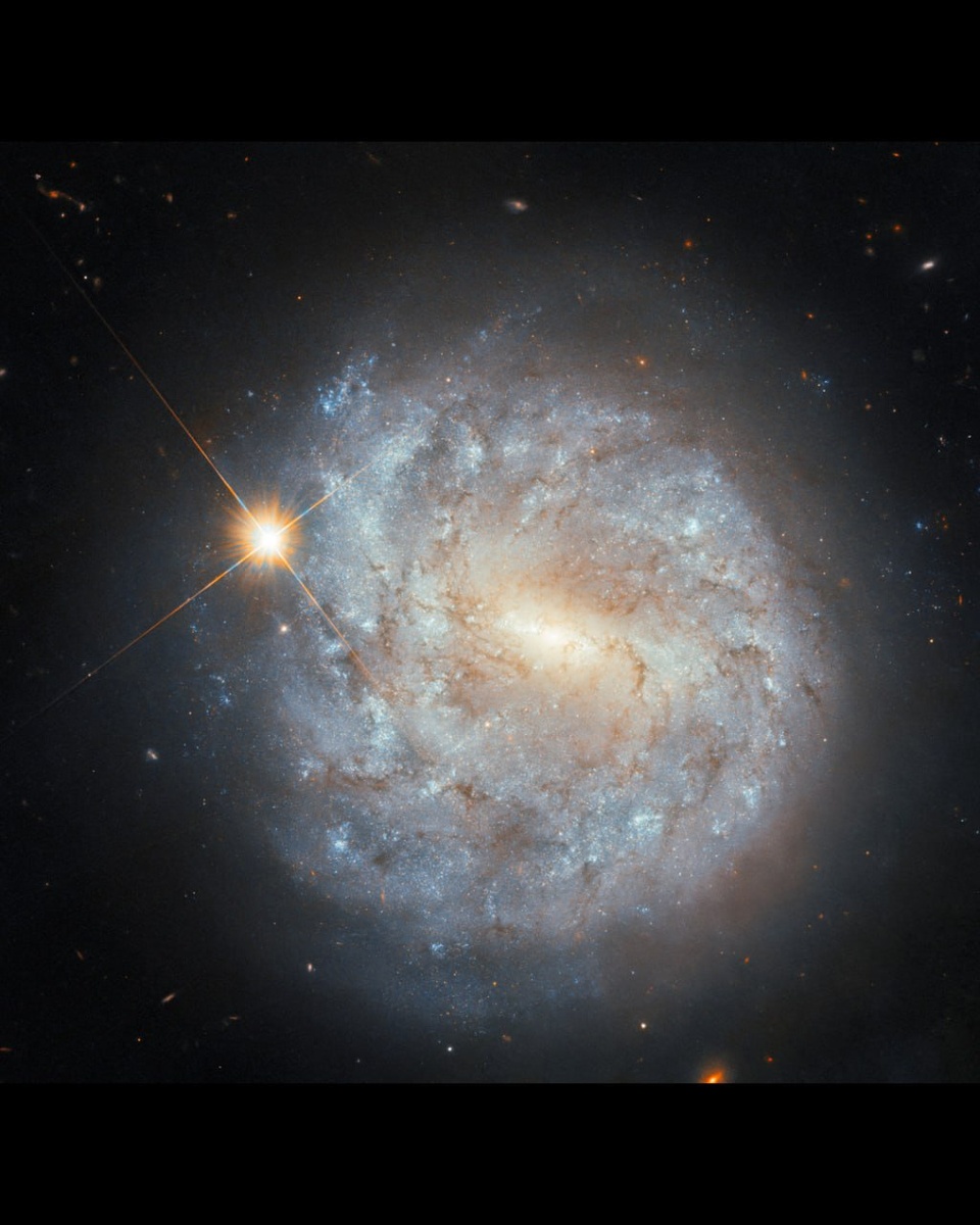 Спиральная галактика и яркая звезда в созвездии Девы NGC 4900, спиральная галактика с перемычкой (тип SBc), расположена на расстоянии 45 миллионов световых лет от Земли. На изображении она кажется близкой к яркой звезде, но эта звезда находится в 7109 световых лет от нас в Млечном Пути. Сочетание данных с телескопа «Хаббл» (NASA/ESA) включает наблюдения двух инструментов: Advanced Camera for Surveys и Wide Field and Planetary Camera 2. Материалы были получены в рамках двух программ, разделённых более чем 20-летним интервалом. Цель исследований: изучение процессов, связанных с гибелью массивных звёзд. В одной программе анализировались остатки сверхновых, а в другой — закладывались основы для прогнозирования будущих взрывов.
