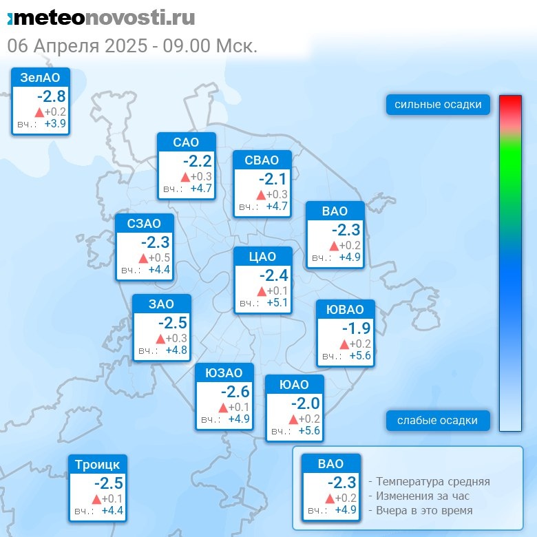 В 9:00 в Москве было от -3.4°C до -1.4°C, средняя температура -2.2°C #погода #Москва #весна #температура #6апреля #воскресенье