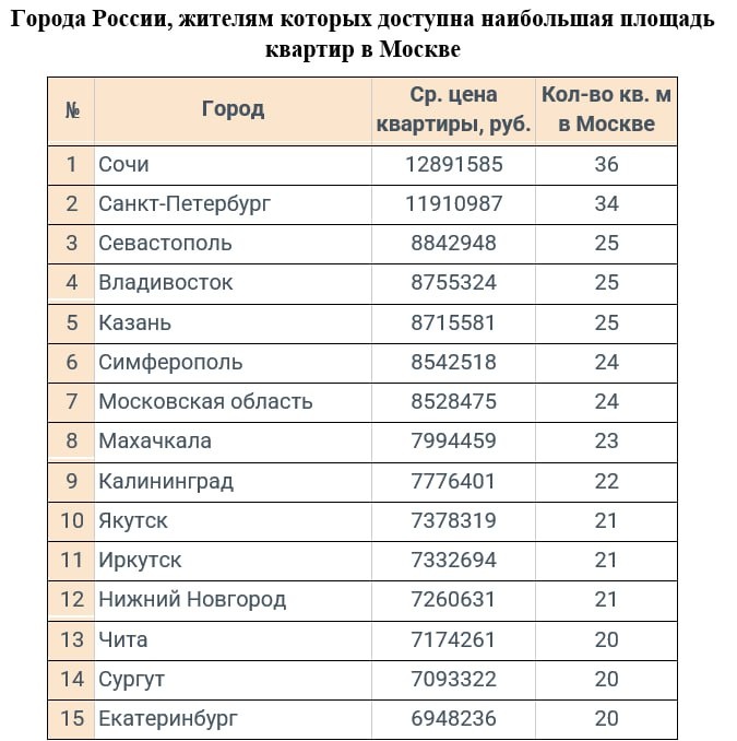 Житель Владивостока может позволить себе студию в 25 квадратных метра в Москве, если продаст в приморской столице однокомнатную квартиру. К такому выводу пришли аналитики федерального портала «Мир квартир». Для сравнения взяли среднюю стоимость жилья во Владивостоке — 8,7 миллиона рублей. За такую же цену могут приобрести квартиру в российской столице жители Казани и Севастополя. Самую большую площадь получится купить сочинцу — свою квартиру он в среднем может продать за 12,8 миллиона рублей и купить в Москве 36 квадратных метров. Чуть меньше достанется жителю Санкт-Петербурга — 34 квадрата. Сложнее всего придется жителям Нижнего Тагила — всего 10 квадратов, чуть больше — у жителей Магнитогорска, Кургана и Волжского — 12 квадратов, а жители Брянска, Оренбурга, Смоленска, Ульяновска и Астрахани получат по 13 квадратных метров. Все это комнаты в коммуналках. В среднем, жилье площадью в 18 квадратных метров может позволить себе в Москве среднестатистический россиянин из региона с учет