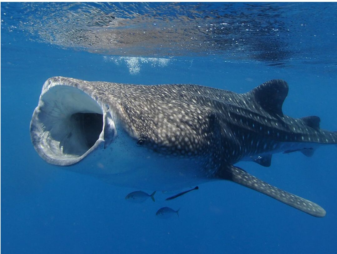 🦈 Китовая акула — страшная, но добрая глыба. Это самая большая рыба в мире — до 12 метров длиной. Гигантская пасть, размером с туристическую лодку… но ест она планктон. Медленно плывёт, широко открывает рот и пропускает через себя океан, как гигантский фильтр. Можно плавать рядом, и она даже не заметит. Или заметит — и проигнорирует. Мудрая такая. Даже когда рядом — не страх, а уважение. Китовая акула — морская маршрутка для микрожизни, и гигант с добрым сердцем.