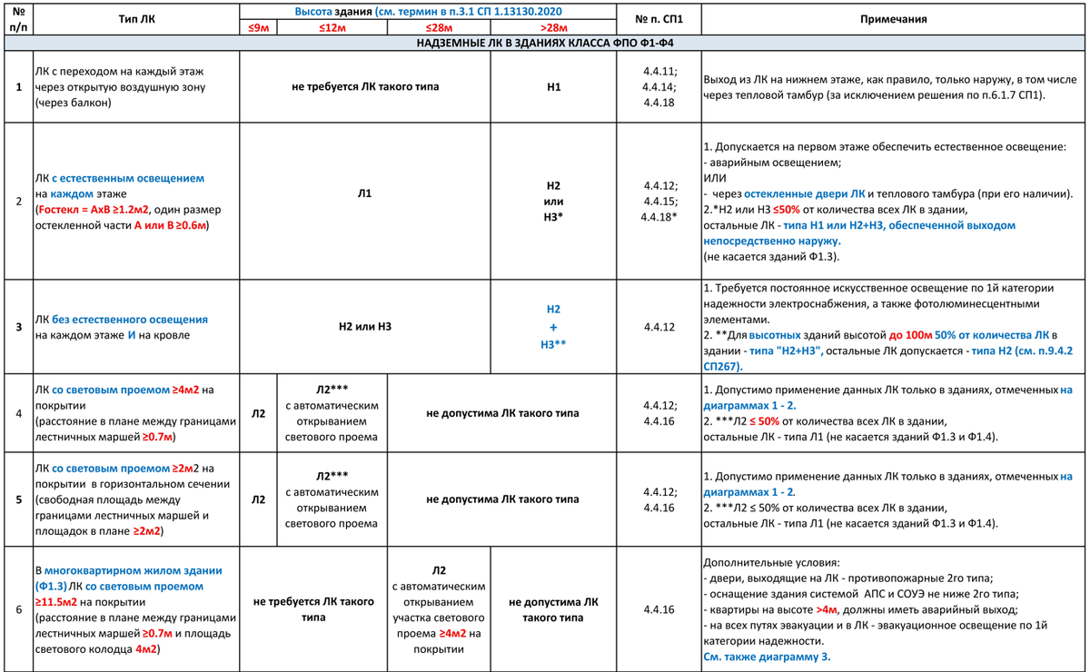 Зачастую для проектирования систем противодымной вентиляции получаем «сырые» планировки, в которых даже не обозначены и не зафиксированы типы лестничных клеток. Составил шпаргалку для инженеров по определению типов ЛК по планировкам «АР», в которых не указаны типы лестничных клеток. Свел все основные нормативные требования в таблицу и сопутствующие диаграммы. Напомню, что типы лестничных клеток зафиксированы в Статье 40 ФЗ-123. Как я уже писал в своих более ранних статьях, в соответствии с п.4.4.18 СП1.13130.2020 в зданиях высотой свыше 28м нормируется обязательно выполнение незадымляемых лестничных клеток. 28м – это высота, на которую можно поднять стрелу пожарной машины. Таким образом, в зданиях высотой до 28м есть возможность спасения людей из заблокированных продуктами горения участков здания с использованием пожарной лестницы спасательной машины, а в зданиях свыше 28м такая возможность отсутствует. В связи с чем и предъявляются более строгие требования по обеспечению эвакуации люд