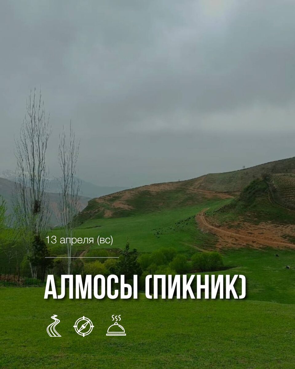Приглашаем на незабываемый пикник на природе! 🌿🔥 Отправляемся в живописную локацию, где вас ждет день, наполненный радостью, вкусной едой и веселыми развлечениями! 🔸 Для детей – увлекательные игры, запуск воздушных змеев и море веселья! 🔸 Для всех гостей – национальные игры, активные развлечения и душевное общение. 🔸 Сочные крылышки и ароматные угощения, приготовленные на огне. 📍 Когда: 13.04.2025 📍 Где: Алмосы 💳 180 сомони 📍 Сбор: В 07:30 у шоколадницы дом печать Берите с собой хорошее настроение, и мы позаботимся обо всем остальном! 🌞🔥 ☎️ для записи 989093020 или @daidushki_tours☄️