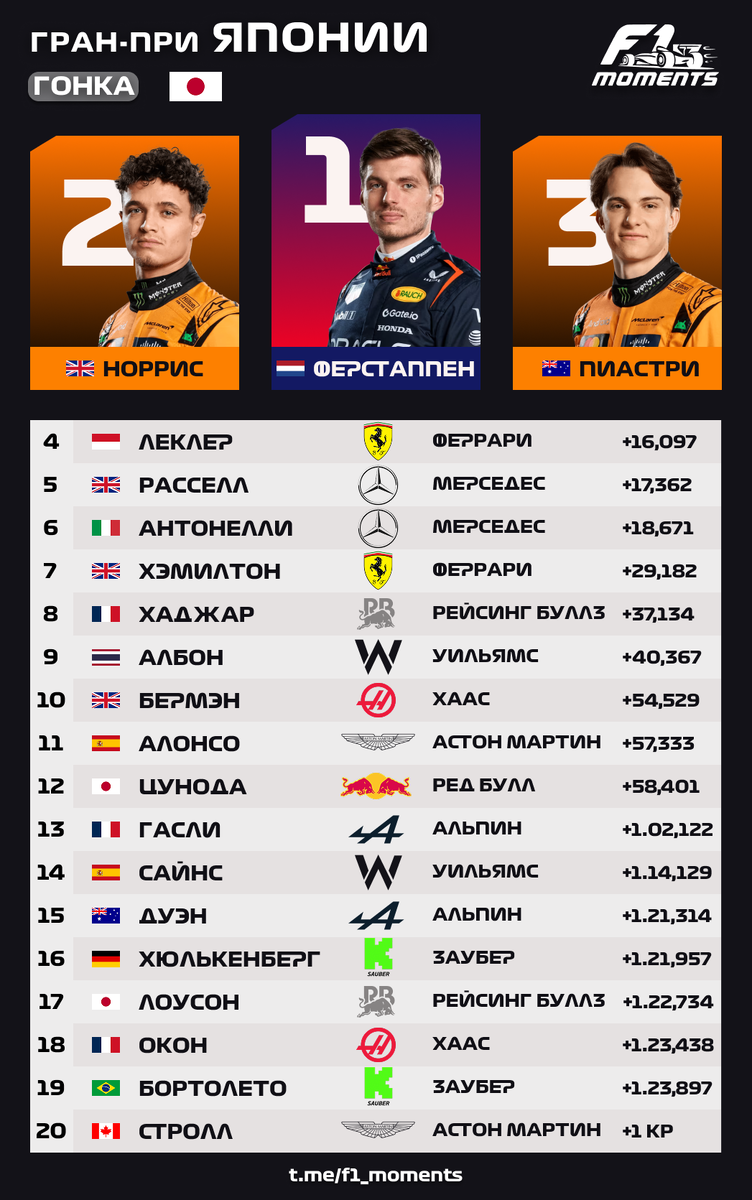 Результаты гонки. Норрис и Пиастри составили компанию Максу на подиуме, у Феррари и Мерседеса двойной финиш в очках. Хаджар, Албон и Бермэн - тоже молодцы, безошибочно провели гонку после вчерашней хорошей квалификации. Цунода пока что-то далековато от обещаного подиума… @f1_moments