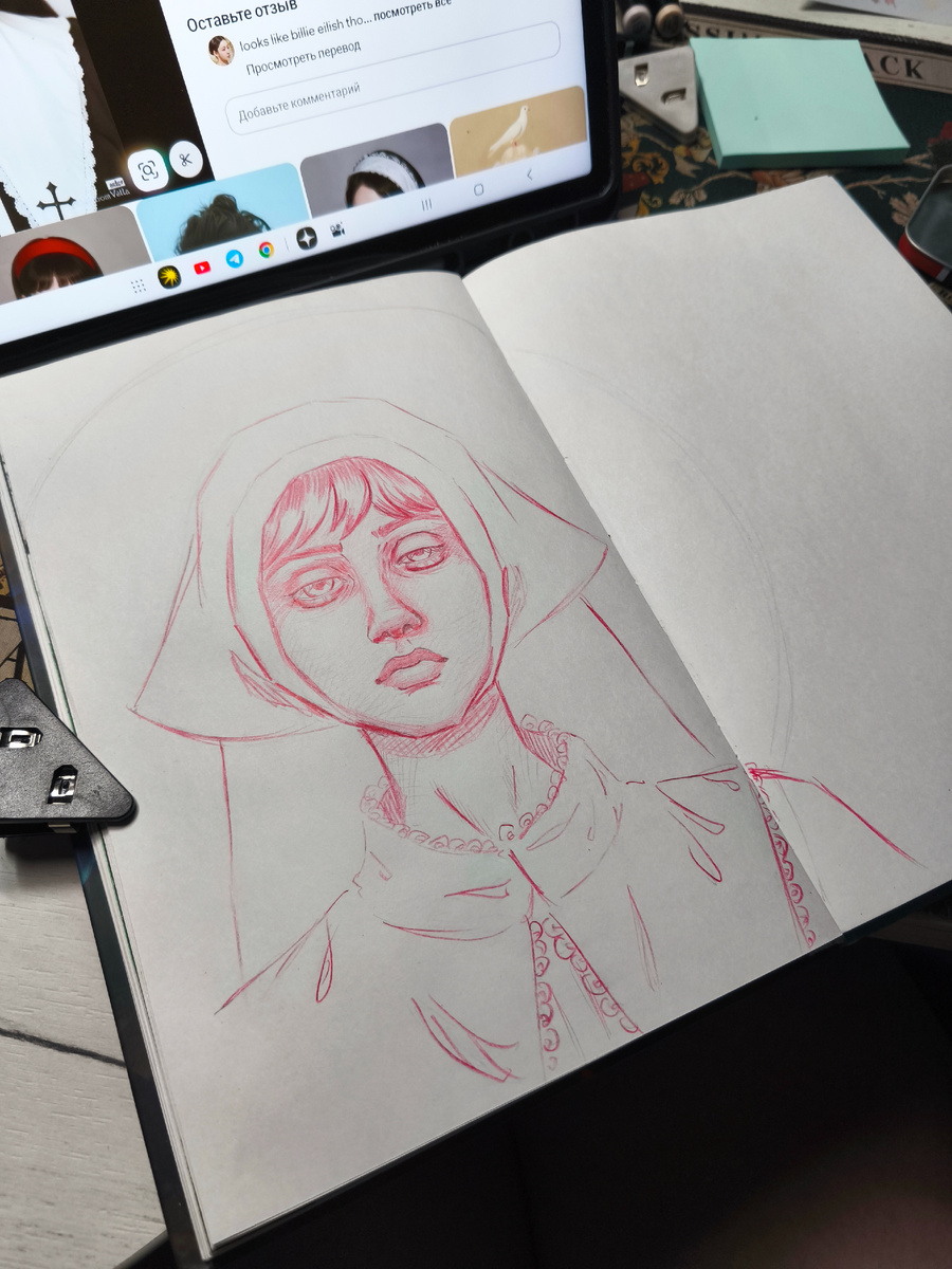 За эту работу мне сказали, что мой уровень в рисовании вырос. Это было очень приятно услышать! Приятно, когда и окружающие отмечают твой рост! Ведь мы сами зачастую бываем необъективны по отношению к себе. А мнение со стороны как бы подтверждает, что все так и есть. В последнее время я действительно заметила, что рисовать портреты мне стало легче. Я почти всегда довольна результатом, а наброски уже рисую достаточно быстро. Разумеется сейчас не идет речь про портреты с фотографическим сходством. Обычно я рисую по референсу для общего понимания расположения теней и черт лица. Но не вымеряю пропорции конкретного лица. Плюс ко всему я не стремлюсь в реализм, а рисую в каком-то своем стиле. Как всегда моим вдохновением стала фотография девушки на Pinterest. А если нравится и вдохновляет, значит надо рисовать! На самом деле я уже несколько недель думала про этот Референс и вынашивала идею работы. Так что я изначально понимала, что буду использовать черный маркер и жидкую поталь. Жидкая потал