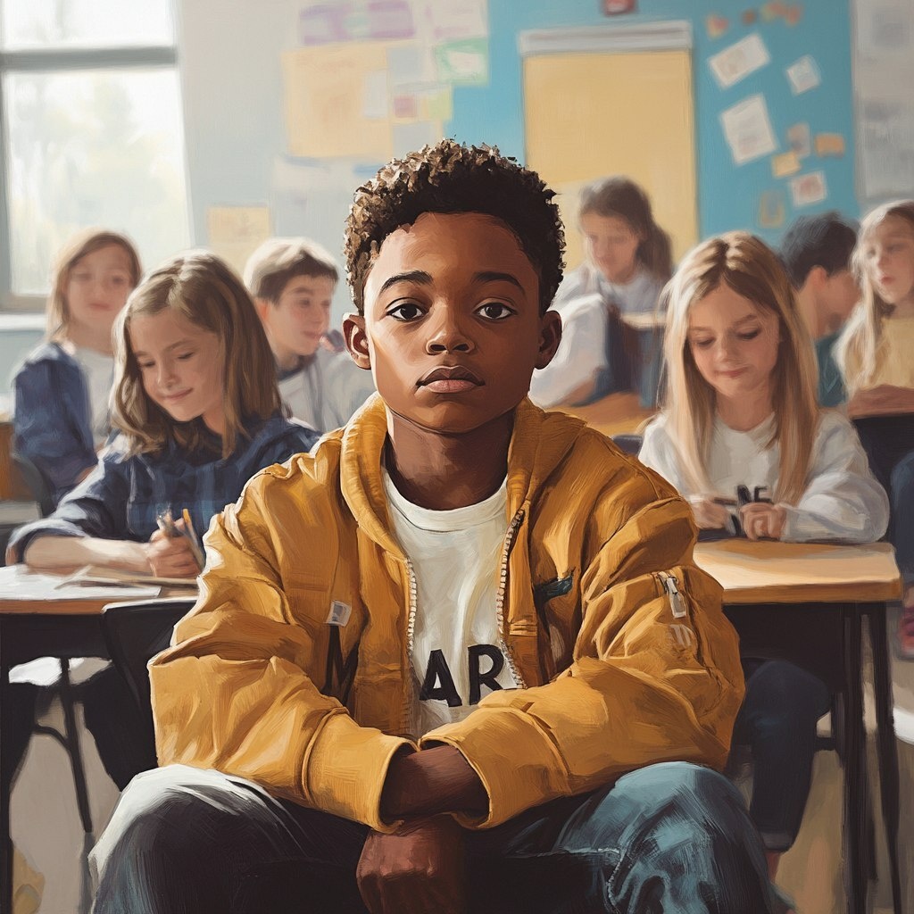 Создано на основе запроса: 1. A modern classroom with diverse children, and a black boy (Maddox) sitting alone while a group of kids snicker in the background emotional tone, realism, soft lighting. --- Автоперевод: 1. Современный класс с разнообразными детьми и черный мальчик (Мэддокс), сидящий в одиночестве, в то время как группа детей хихикает на фоне эмоционального тона, реализма, мягкого освещения. Как тебе такая картинка? 🤔 https://dzen.ru/id/65c0c65c86e4f837c27b24d7 #ИИ #AI #нейросеть #midjourney #art