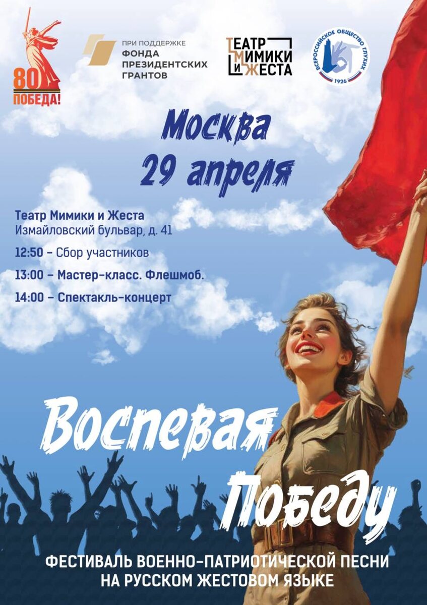 ✋ 29 апреля 2025 года в столичном Театре Мимики и Жеста состоится фестиваль военно-патриотической песни на русском жестовом языке «Воспевая Победу», приуроченный к 80-летию Победы в Великой Отечественной войне.