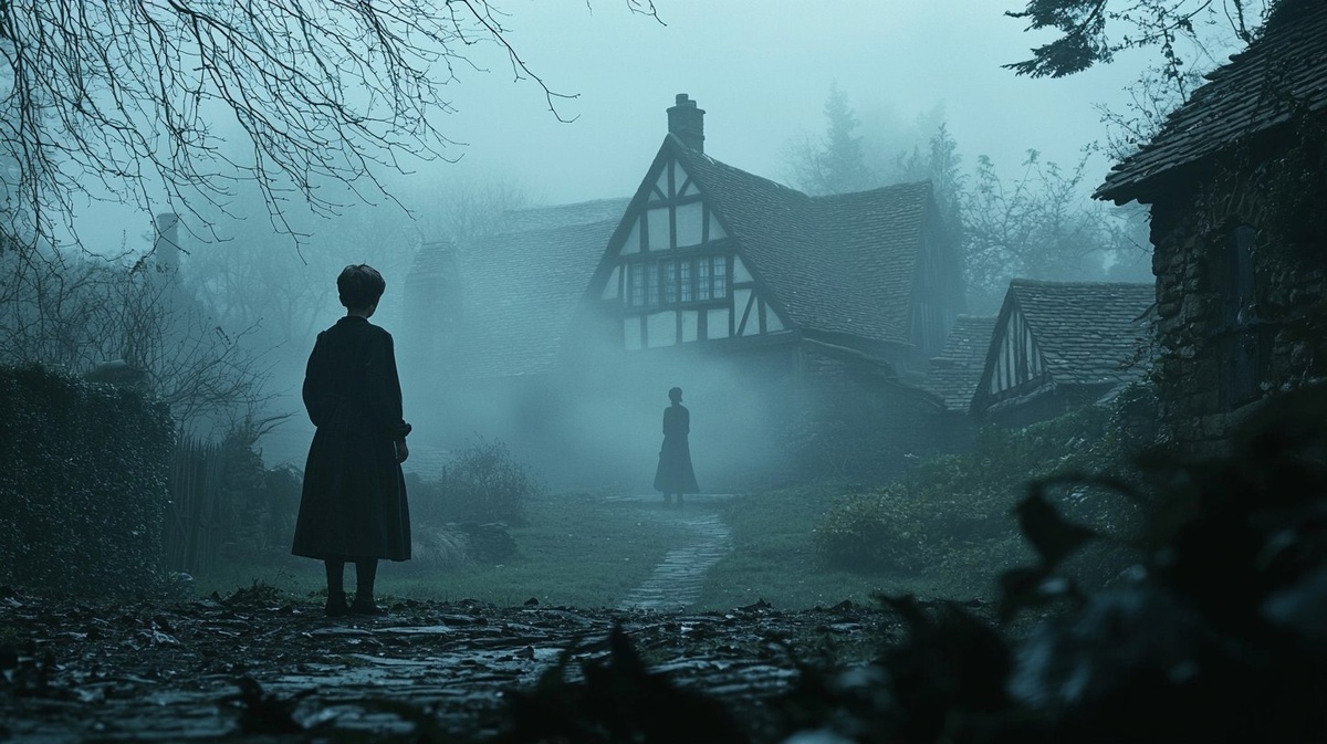 Создано на основе запроса: A dramatic cinematic scene set in a 16th century English village, foggy atmosphere, old timber-framed cottages, a worried young boy in period clothing standing in the foreground, looking uncertain, in the distance a mysterious silhouette of a figure in a dress standing in the mist, soft lighting, moody and mysterious, historical realism