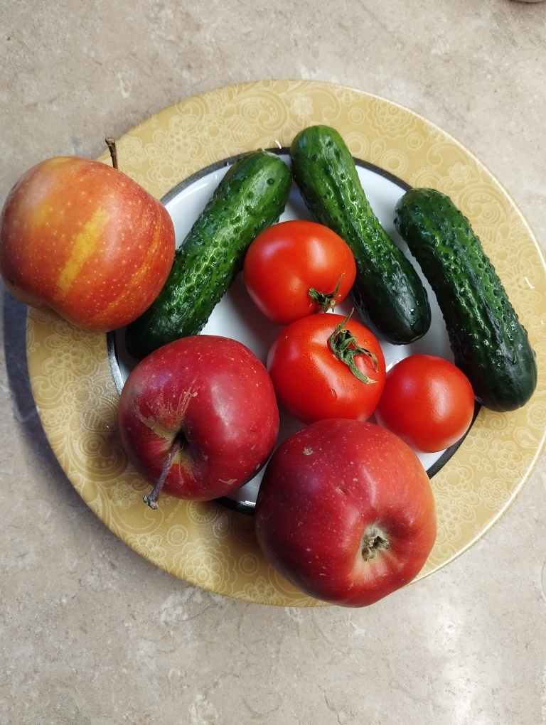 В больнице кормят хорошо и разнообразно. Но это питание скучное и хочется добавить к нему немного вкусняшек. 1) Фрукты и овощи. Мою все и раскладываю по отдельным пакетам. 2) Чай, кофе, сахар. К кофе сливки в тетрапаке. Еще можно взять небольшие упаковки соков. 3) Нарезки сыра и колбасы. Хлеб дают, но с бутербродом вкуснее. 4) Конфеты, печенье, орешки. 5) 2-3 полноценных вторых, в одноразовых лоточках. Если дали какое-то блюдо, которое не нравится и хочется заменить домашним. За неделю такое было два раза, и это не плохо. В этот раз положу запеченную свинину с помидорами и кабачками и на гарнир запеканку из картофеля под сыром. 6) Майонез, кетчуп, соусы. Нужно выбрать подходящий размер упаковки. Хранится все в холодильнике. Домашняя еда добавляет разнообразия в скучный рацион.