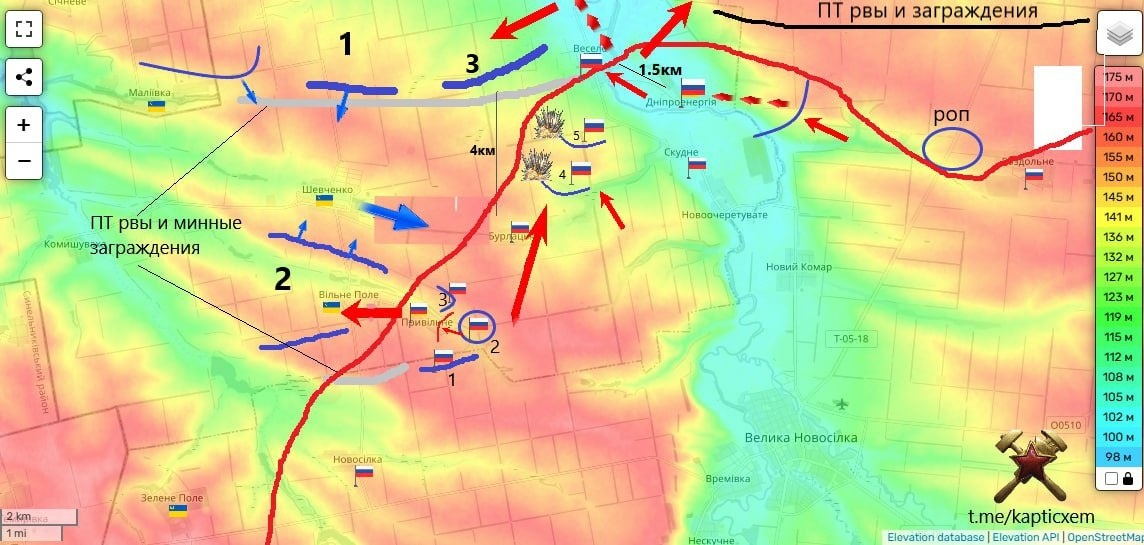 В ответ на пост Севернее Великой Новоселки. Завязался бутон "Веселого" цветка (продолжение) Западнее Веселого серьезные укрепления противника №3, которые нам теперь фронтально атаковать совсем необязательно. Красным обозначены пулеметные точки с секторами огня. Фотография опорника взята с ТГК "Инженерные сооружения ВСУ" Оборону тут держат части 110 и 141 мехбригад противника. схемы и карты